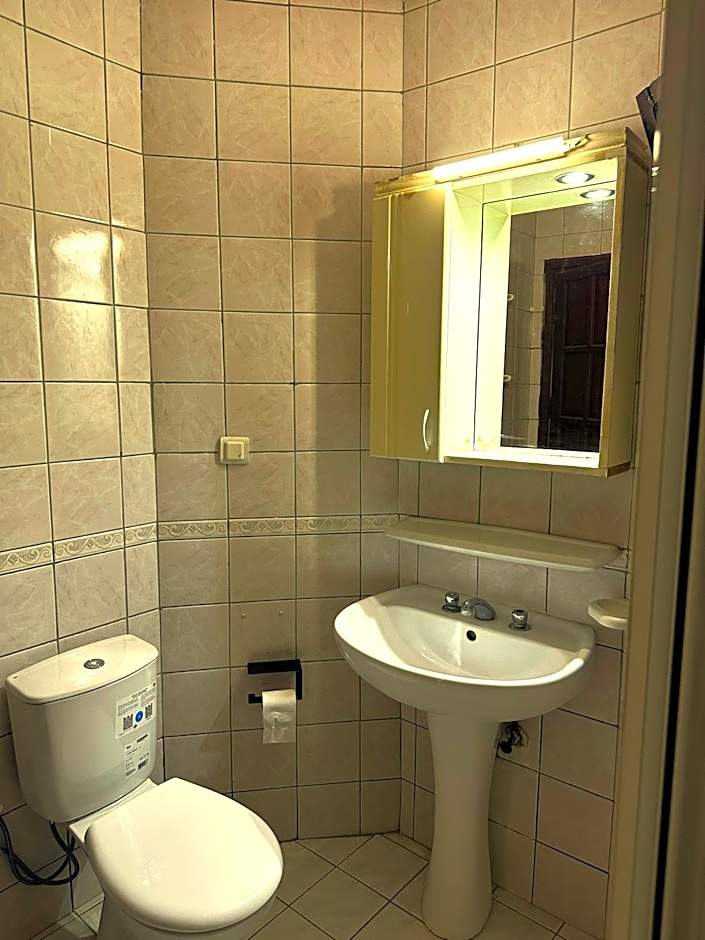 Air-conditioned room with a TV and a private bathroom with shower and hairdryer.