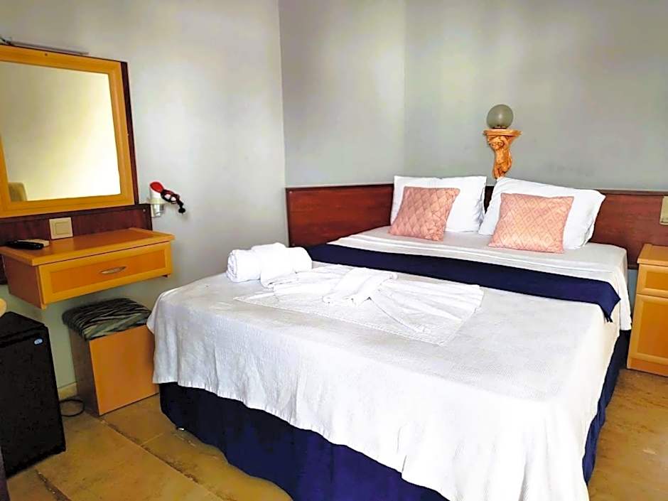 Air-conditioned room with a TV and a private bathroom with shower and hairdryer.